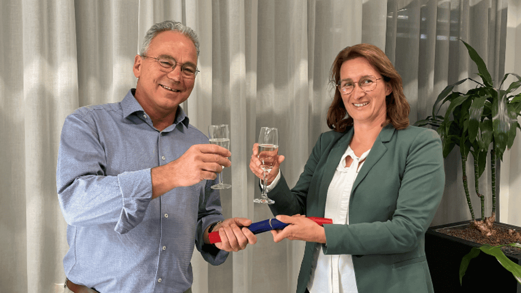 Ronald de Niet passes the baton to Marja van Genugten.