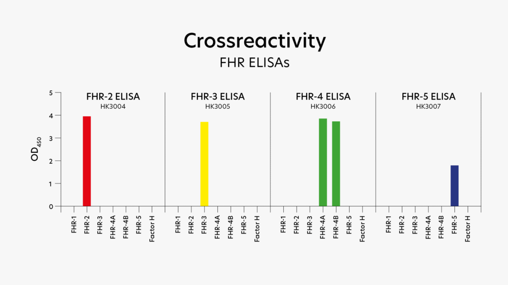 We developed validated ELISAs for FHR-2, FHR-3, FHR-4 and FHR-5 that do not cross-react with other members of the FH family, (Figure 3)[8]. In addition, Hycult offers ELISAs for Factor H and the Factor H 402H/Y variant.