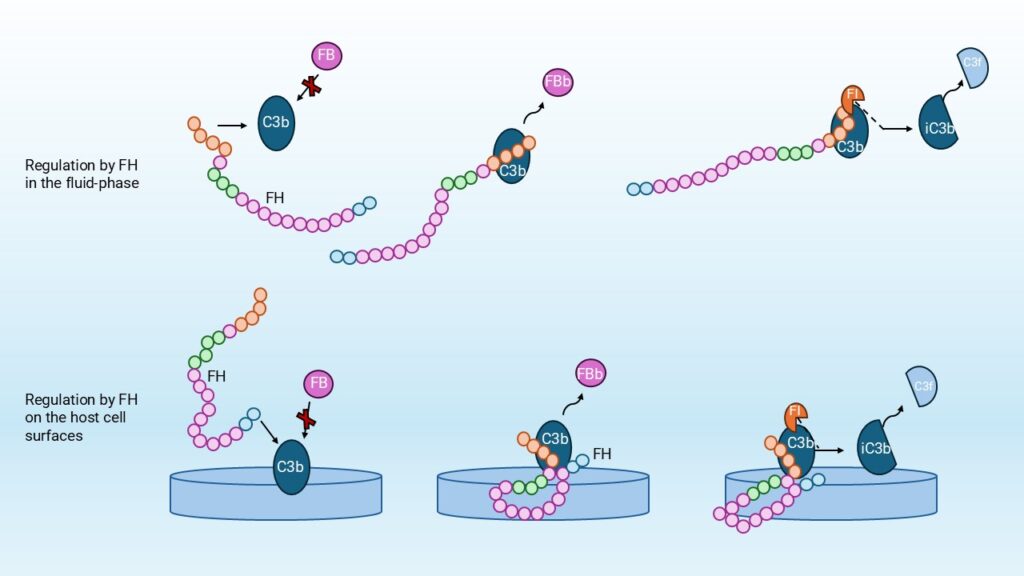 FH is the main regulator of the AP, acting both in the fluid phase and on cell surfaces. In the fluid phase, FH prevents excessive amplification of the complement system by specifically binding C3b, thereby preventing the formation of the C3bBb convertase complex, (Figure 1). Additionally, when FH is bound to the cell surface, it provides local protection by binding to host-specific surface markers such as sialic acids and glycosaminoglycans, which enables discrimination between self and non-self surfaces. This binding inhibits complement activation directly at the site of C3b deposition [1]. Further roles will be discussed in the upcoming paragraphs.