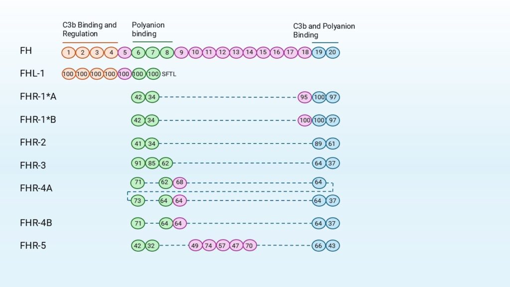 To complete the family, there are five FHRs: FHR-1, FHR-2, FHR-3, FHR-4 and FHR-5. In contrast to FH, it is suggested that they can enhance complement activation by competing with FH for binding factors such as C3b and glycosaminoglycans [8]. Despite their sequence homology, FHRs lack the regulatory domains required for complement inhibition. Their ability to modulate complement activation by displacing FH highlights their role in the modulation of immune responses. However, their precise biological role remains poorly understood, underlining the need for continued research into the contribution of the FH protein family to immune system regulation [4] [6].