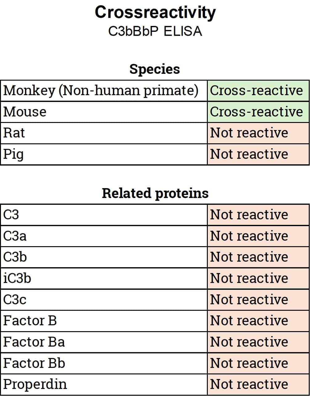 Our new ELISA kit for C3bBbP is highly specific, and does not cross-react with other related proteins as shown in the table below. The new ELISA kit for C3bBbP, however, shows cross-reactivity with other species such as monkey (non-human primate) and mouse (table below). Since no specific kits for these species are currently available on the market, this kit may also serve as a suitable option for measuring C3bBbP levels in mouse or monkey serum and plasma samples